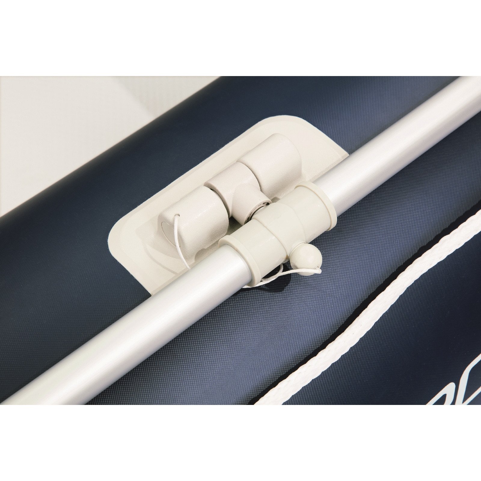 Oppblåsbar gummibåt fra Bestway. En utrolig sterk konstruksjon laget for å tåle tøffe påkjenninger med patentert TriTech teknologi. I tillegg har den ekstra beskyttelsesbånd rundt hele båten, også under kjølen. Båten er konstruert med 3 luftkammer for din sikkerhet. V-formet oppblåsbar forsterket kjøl for de beste kjøreegenskaper. Årene sitter fast både under bruk og når de ikke benyttes. Denne oppblåsbare gummibåten er også utstyrt med bæretau langs sidene og ett 10 meters tau foran. Det er 3 stålkroker foran for taufeste. Gummibåten er utstyrt med solid motorfeste, plugg for vanndrenering og repkit. Benkeseter som er enkle å montere - ingen verktøy behøves. Gummibåten har også spennbånd for bensintank. Solid bæreveske medfølger.